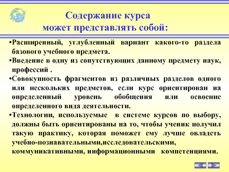 Технологии, используемые в системе курсов по выбору, должны быть ориентированы на то, чтобы ученик получил такую практику, которая поможет ему лучше овладеть учебно-познавательными,исследовательскими, коммуникативными, информационными компетенциями.