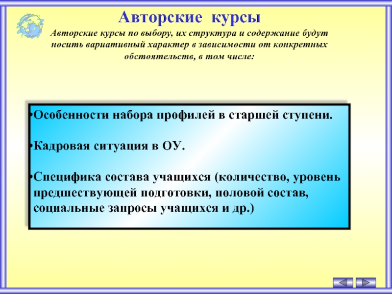 ♦ основанные на использовании имеющегося методического обеспечения (факультативные курсы, блоки дополнительных занятий по обычным учебным предметам и др.).