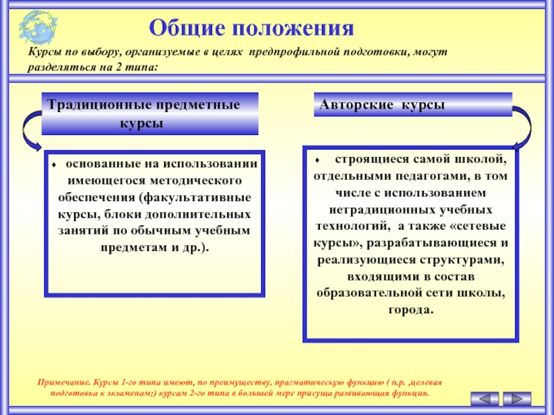 Курсы по выбору, организуемые в целях предпрофильной подготовки, могут разделяться на 2 типа: