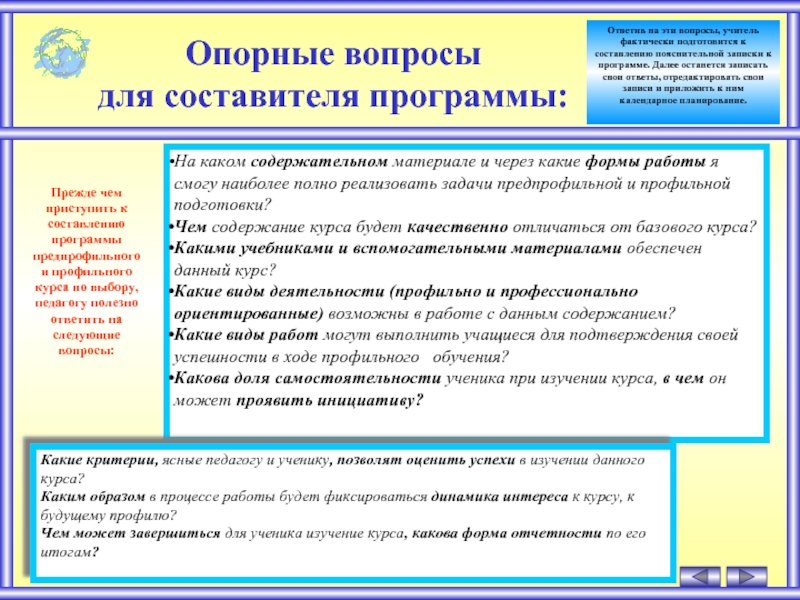 Прежде чем приступить к составлению программы предпрофильного и профильного курса по выбору, педагогу полезно ответить на следующие вопросы: