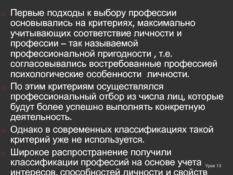 Первые подходы к выбору профессии основывались на критериях, максимально учитывающих