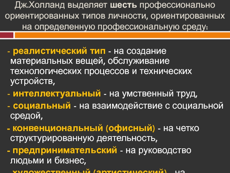 Слайд 5Дж.Холланд выделяет шесть профессионально ориентированных типов личности, ориентированных на определенную профессиональную
