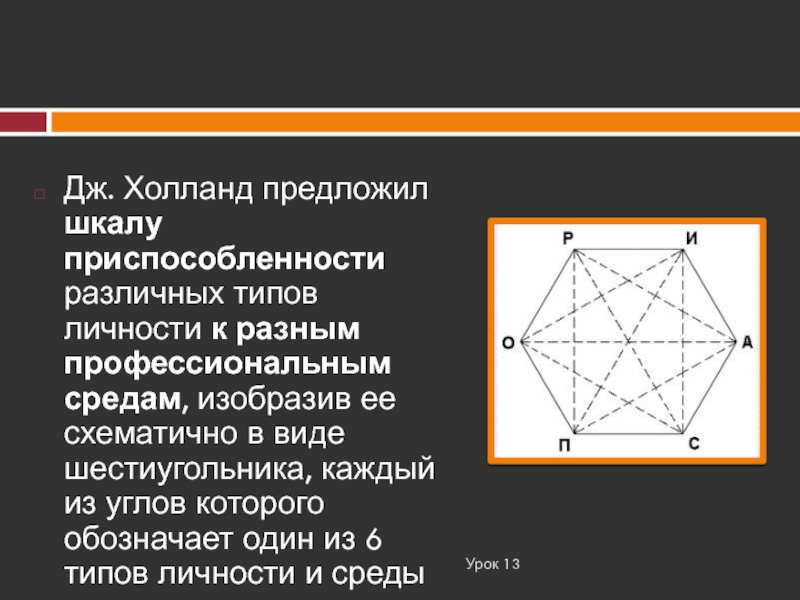 профессиональным средам, изобразив ее схематично в виде шестиугольника, каждый из углов которого обозначает один из 6 типов личности и среды