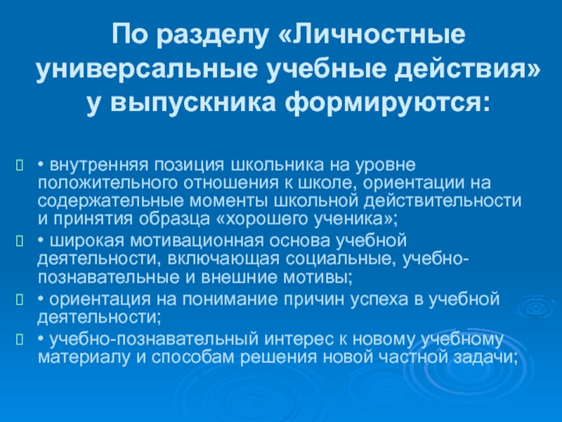 Слайд 13По разделу «Личностные универсальные учебные действия» у выпускника формируются: