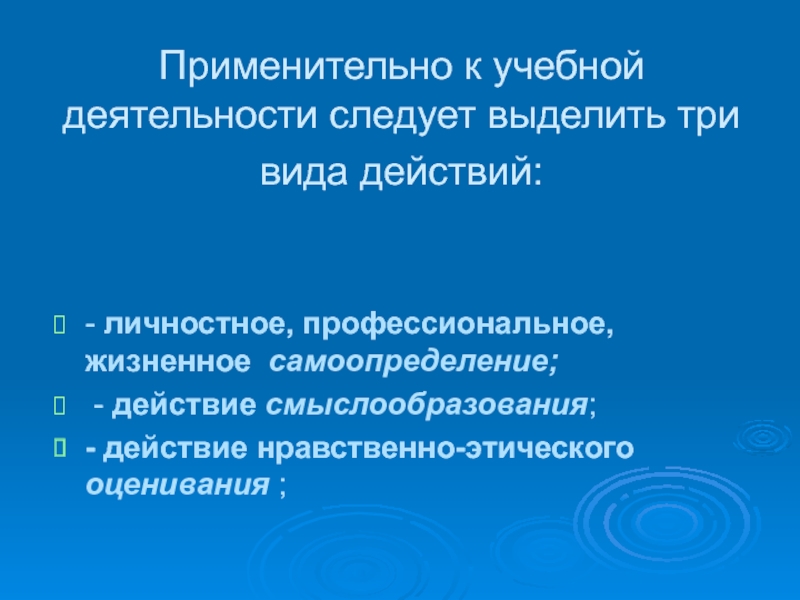 Слайд 9Применительно к учебной деятельности следует выделить три вида действий: