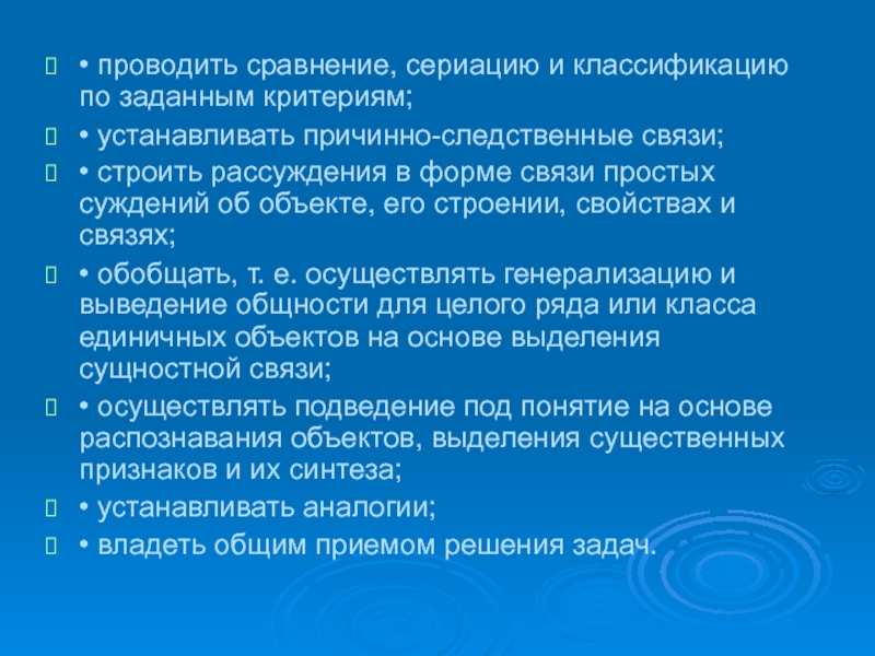 • обобщать, т. е. осуществлять генерализацию и выведение общности для целого ряда или класса единичных объектов на основе выделения сущностной связи;