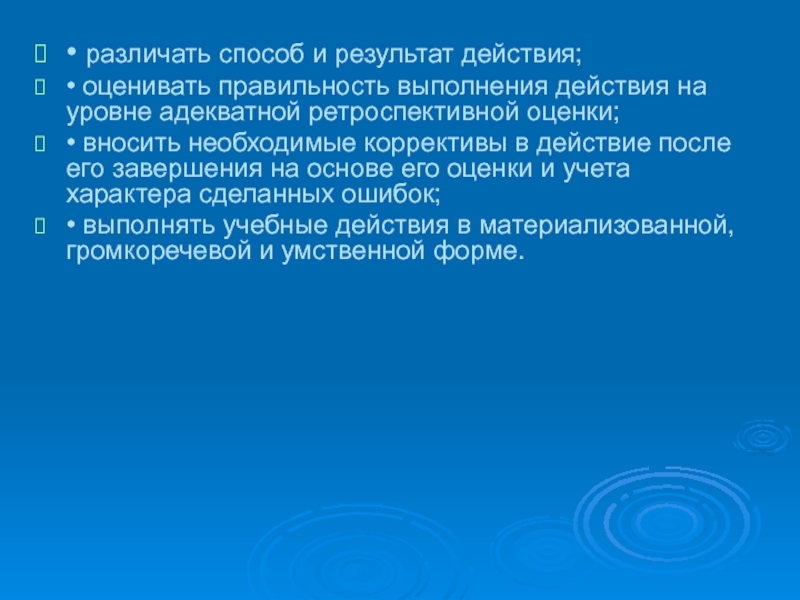 • выполнять учебные действия в материализованной, громкоречевой и умственной форме.