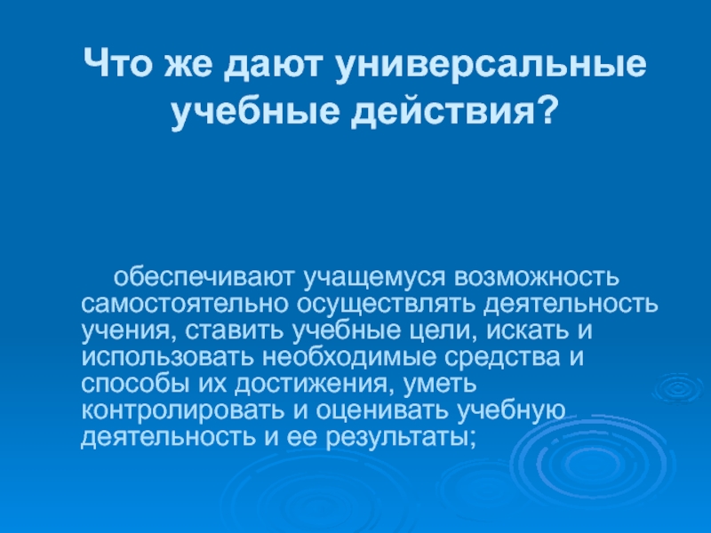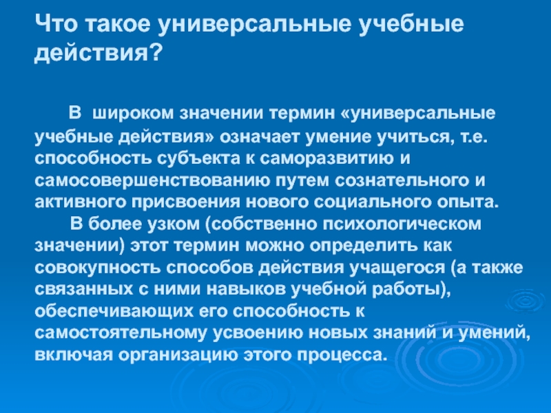 «универсальные учебные действия» означает умение учиться, т.е. способность субъекта к саморазвитию и самосовершенствованию путем сознательного и активного присвоения нового социального опыта.