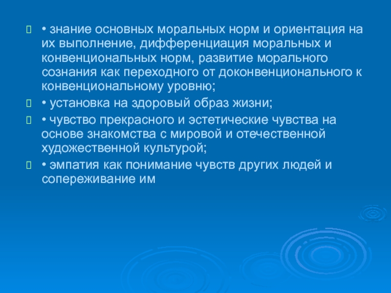 Слайд 15• знание основных моральных норм и ориентация на их выполнение, дифференциация