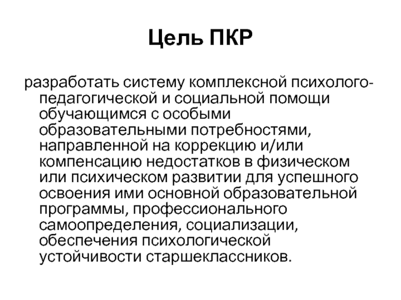 особыми образовательными потребностями, направленной на коррекцию и/или компенсацию недостатков в физическом или психическом развитии для успешного освоения ими основной образовательной программы, профессионального самоопределения, социализации, обеспечения психологической устойчивости старшеклассников.