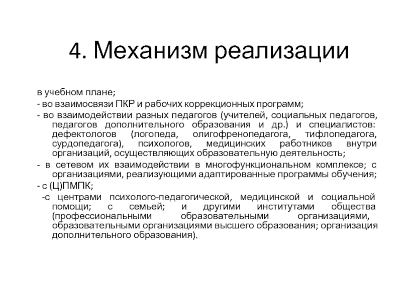 - во взаимодействии разных педагогов (учителей, социальных педагогов, педагогов дополнительного образования и др.) и специалистов: дефектологов (логопеда, олигофренопедагога, тифлопедагога, сурдопедагога), психологов, медицинских работников внутри организаций, осуществляющих образовательную деятельность;