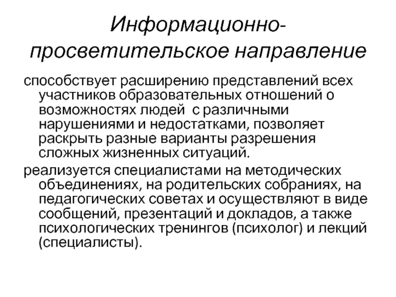 реализуется специалистами на методических объединениях, на родительских собраниях, на педагогических советах и осуществляют в виде сообщений, презентаций и докладов, а также психологических тренингов (психолог) и лекций (специалисты).