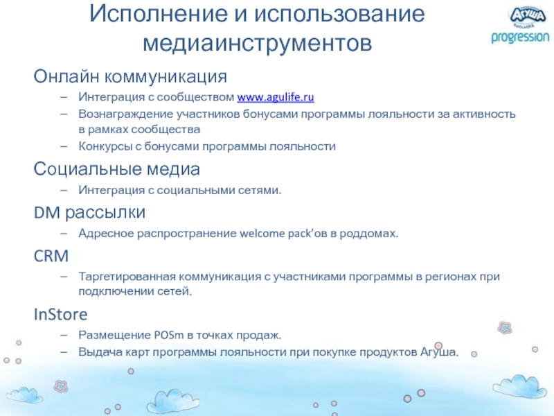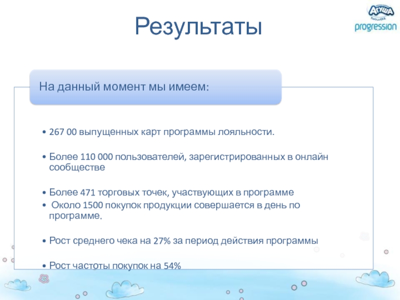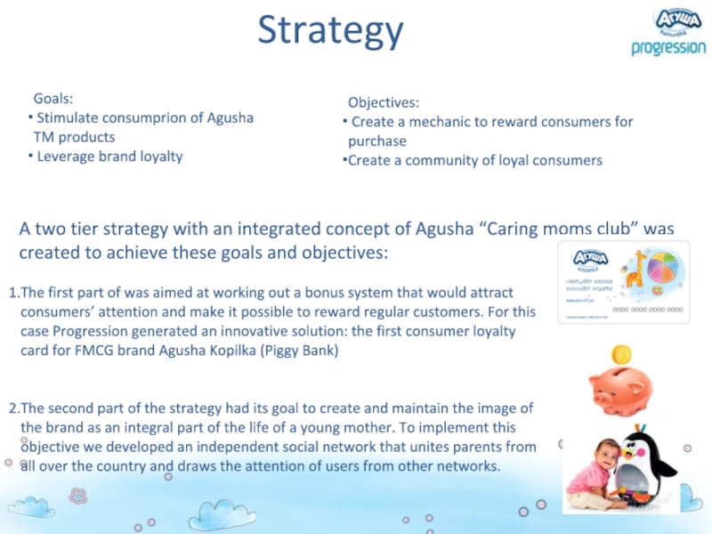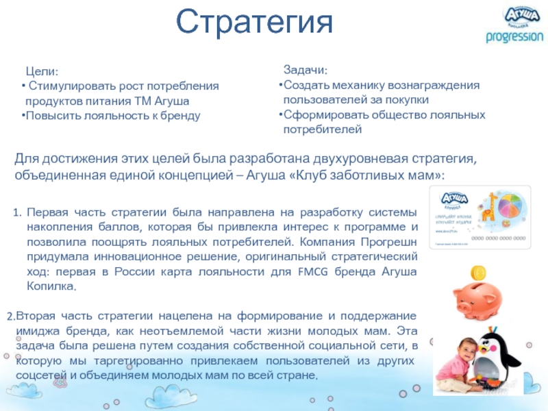Первая часть стратегии была направлена на разработку системы накопления баллов, которая бы привлекла интерес к программе и позволила поощрять лояльных потребителей. Компания Прогрешн придумала инновационное решение, оригинальный стратегический ход: первая в России карта лояльности для FMCG бренда Агуша Копилка.
