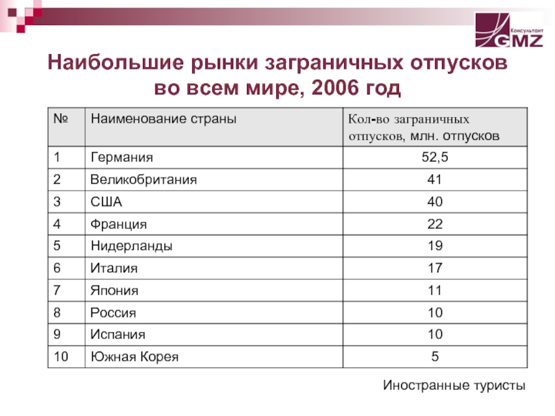 Слайд 16Наибольшие рынки заграничных отпусков во всем мире, 2006 год