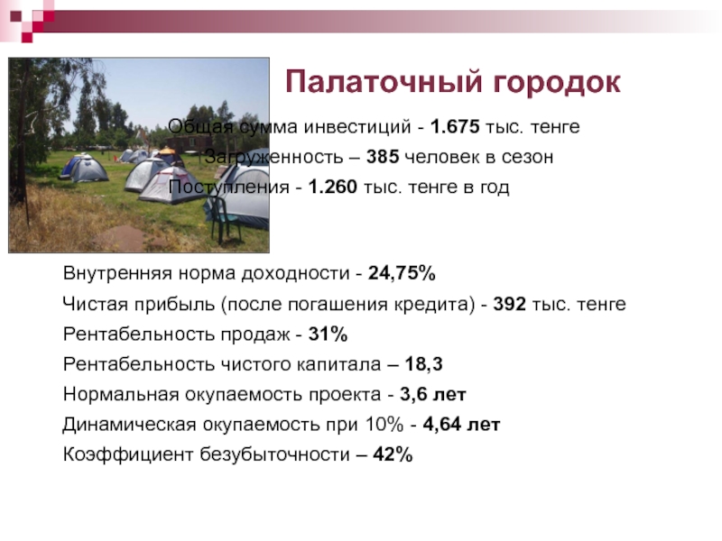 Чистая прибыль (после погашения кредита) –1.503 тыс. тенге