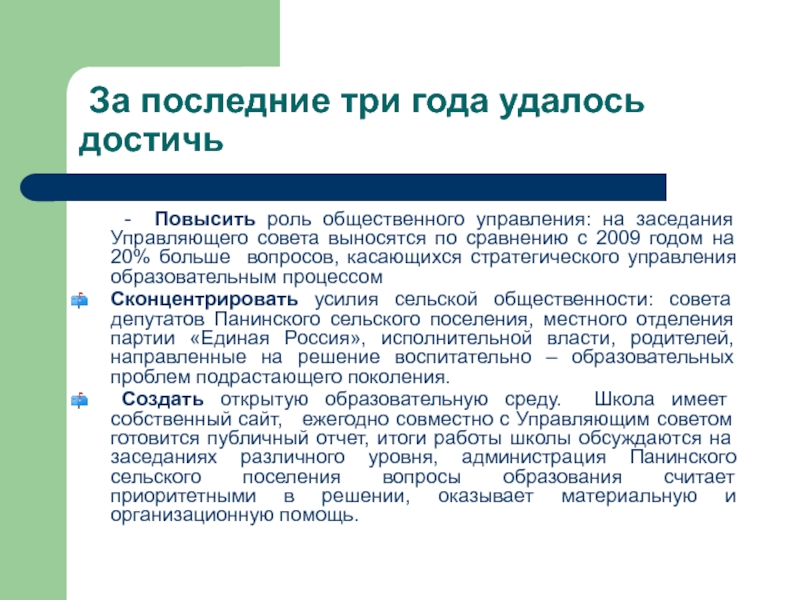 Создать открытую образовательную среду. Школа имеет собственный сайт, ежегодно совместно с Управляющим советом готовится публичный отчет, итоги работы школы обсуждаются на заседаниях различного уровня, администрация Панинского сельского поселения вопросы образования считает приоритетными в решении, оказывает материальную и организационную помощь.