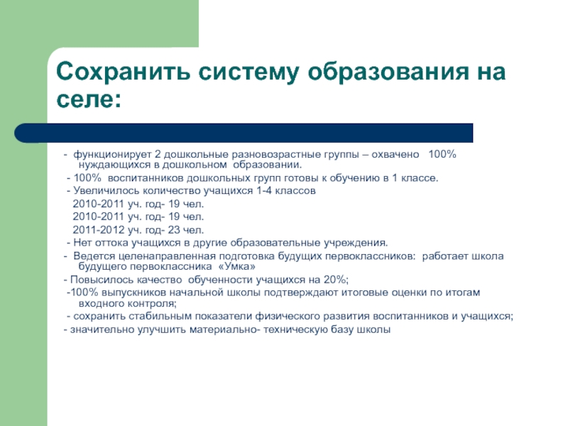 на 2011-2016 годы в условиях сельского социума, переход на ФГОС НОО второго поколения, развитие инновационной деятельности, решение вопросов преемственности между дошкольным и начальным образованием, ресурсное обеспечение Программы развития сельской малокомплектной школы
