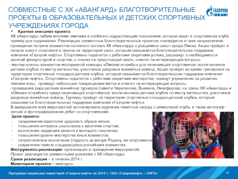 СОВМЕСТНЫЕ С ХК «АВАНГАРД» БЛАГОТВОРИТЕЛЬНЫЕ ПРОЕКТЫ В ОБРАЗОВАТЕЛЬНЫХ И ДЕТСКИХ СПОРТИВНЫХ УЧРЕЖДЕНИЯХ ГОРОДА