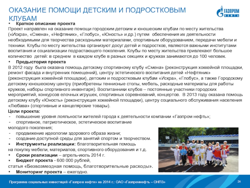 оказание помощи детским подростковым клубам (мебель, спортивный инвентарь)