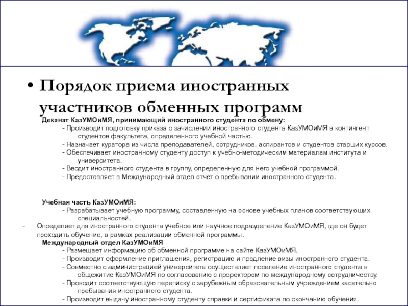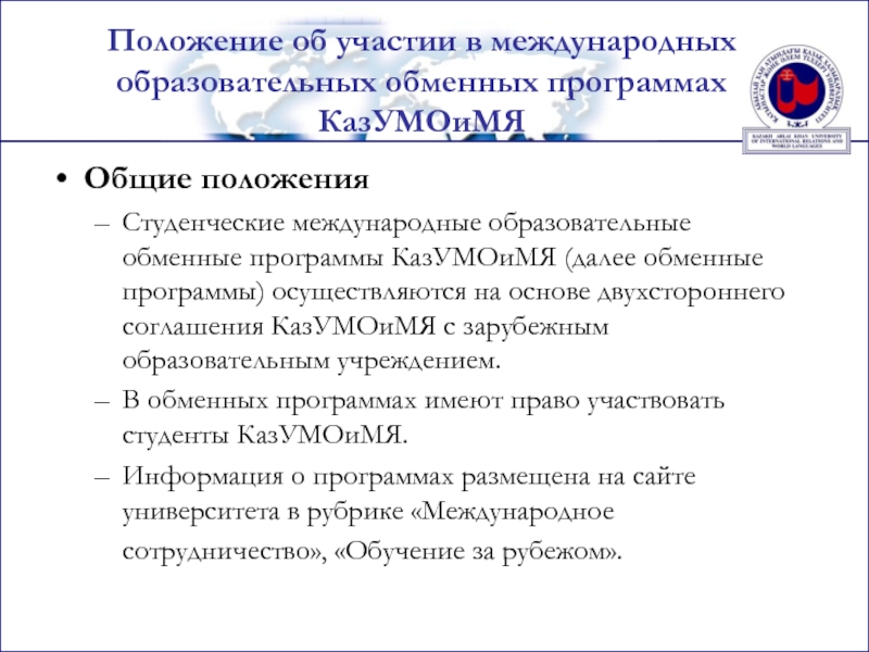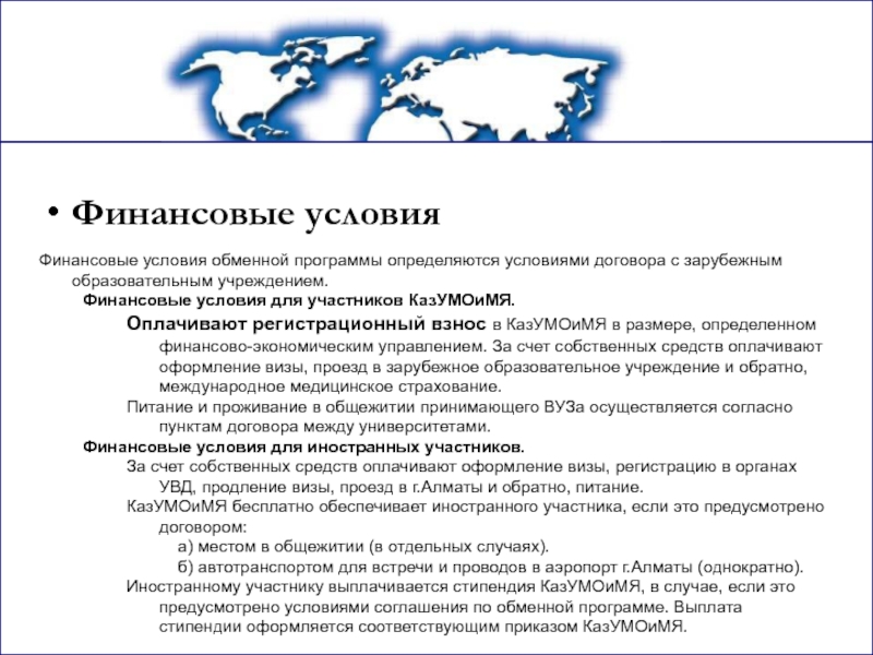 Оплачивают регистрационный взнос в КазУМОиМЯ в размере, определенном финансово-экономическим управлением. За счет собственных средств оплачивают оформление визы, проезд в зарубежное образовательное учреждение и обратно, международное медицинское страхование.