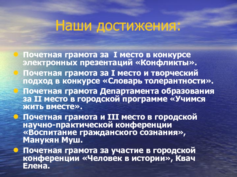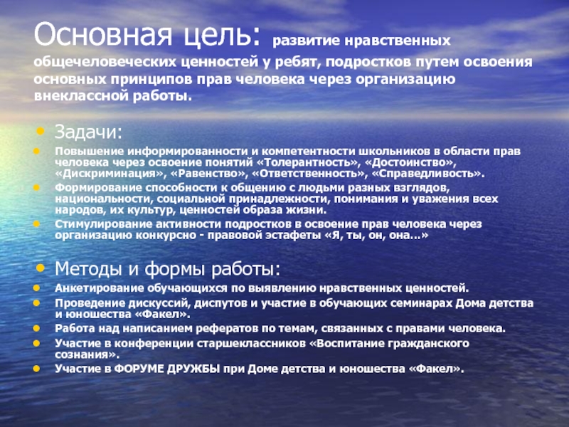 Повышение информированности и компетентности школьников в области прав человека через освоение понятий «Толерантность», «Достоинство», «Дискриминация», «Равенство», «Ответственность», «Справедливость».