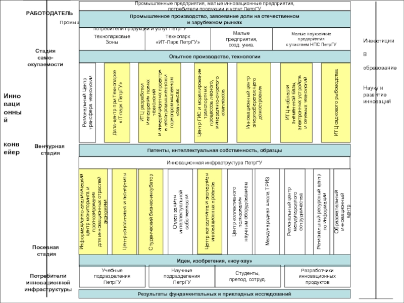 инновационных структур на предприятиях России и зарубежных стран, формирование объектов инновационной инфраструктуры на базе концепции Инновационного конвейера;
