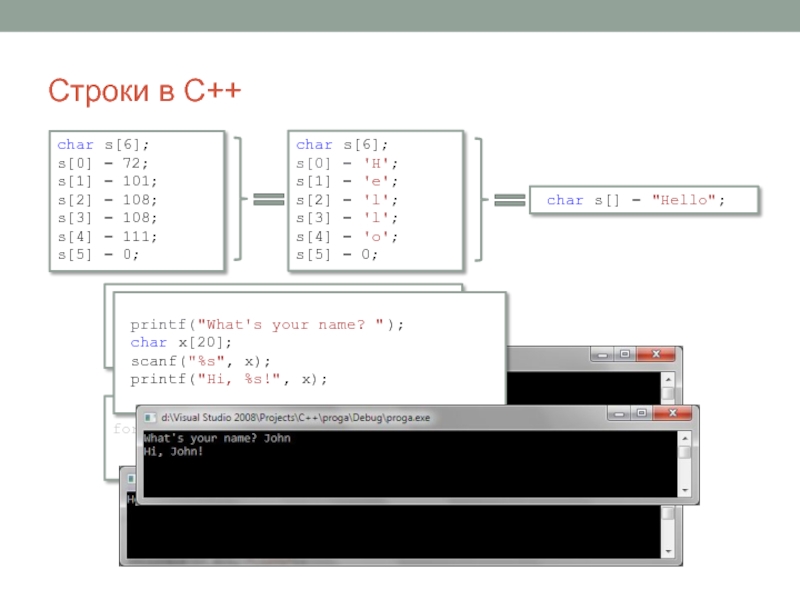 char a[3]; a[0]='H'; a[1]='i'; a[2]=0;