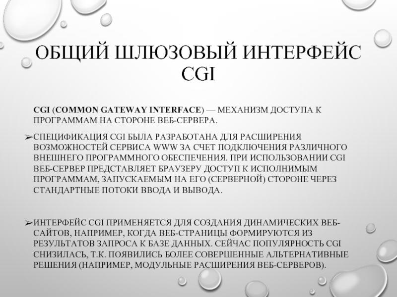 ИНТЕРФЕЙС CGI ПРИМЕНЯЕТСЯ ДЛЯ СОЗДАНИЯ ДИНАМИЧЕСКИХ ВЕБ-САЙТОВ, НАПРИМЕР, КОГДА ВЕБ-СТРАНИЦЫ ФОРМИРУЮТСЯ ИЗ РЕЗУЛЬТАТОВ ЗАПРОСА К БАЗЕ ДАННЫХ. СЕЙЧАС ПОПУЛЯРНОСТЬ CGI СНИЗИЛАСЬ, Т.К. ПОЯВИЛИСЬ БОЛЕЕ СОВЕРШЕННЫЕ АЛЬТЕРНАТИВНЫЕ РЕШЕНИЯ (НАПРИМЕР, МОДУЛЬНЫЕ РАСШИРЕНИЯ ВЕБ-СЕРВЕРОВ).