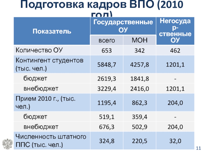 Слайд 11Подготовка кадров ВПО (2010 год)