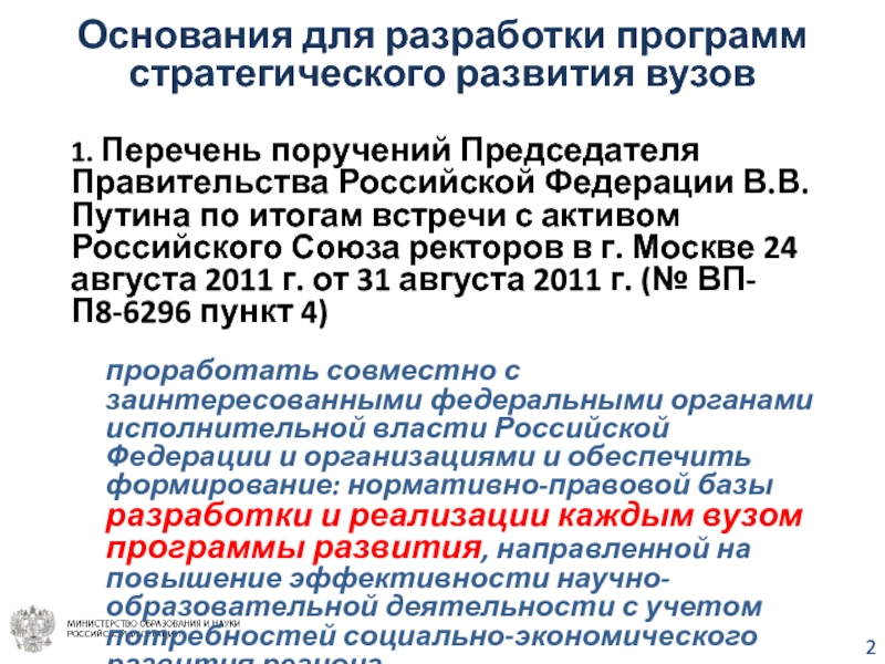 Российской Федерации В.В. Путина по итогам встречи с активом Российского Союза ректоров в г. Москве 24 августа 2011 г. от 31 августа 2011 г. (№ ВП-П8-6296 пункт 4)