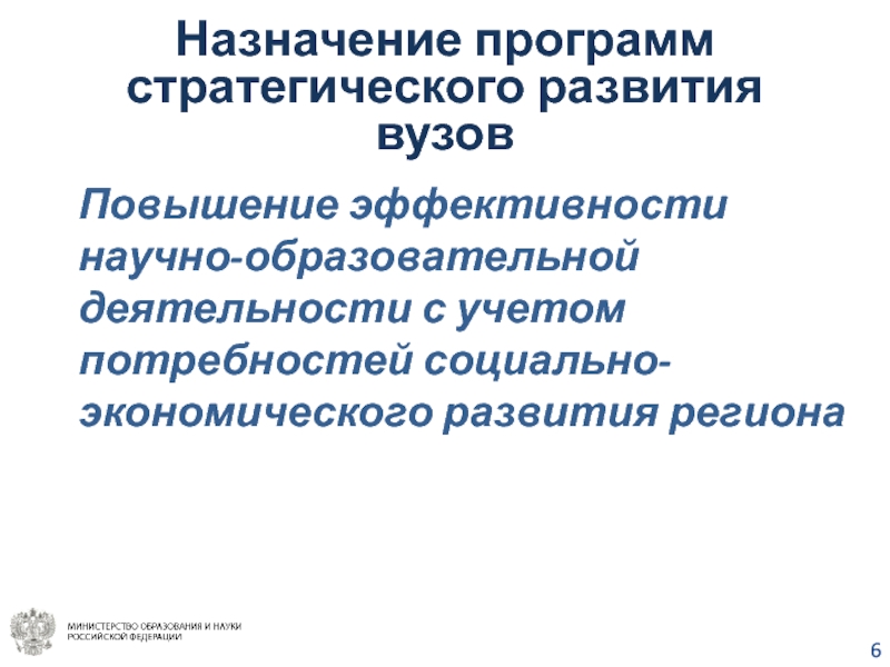 проработать совместно с заинтересованными федеральными органами исполнительной власти Российской Федерации и организациями и обеспечить формирование: нормативно-правовой базы разработки и реализации каждым вузом программы развития, направленной на повышение эффективности научно-образовательной деятельности с учетом потребностей социально-экономического развития региона