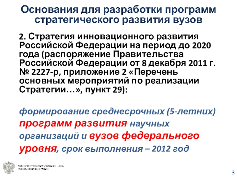 Слайд 3Основания для разработки программ стратегического развития вузов