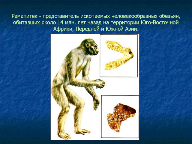 Слайд 7Рамапитек - представитель ископаемых человекообразных обезьян, обитавших около 14 млн. лет