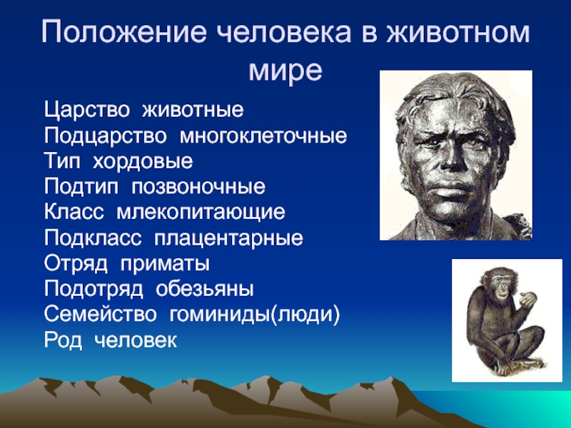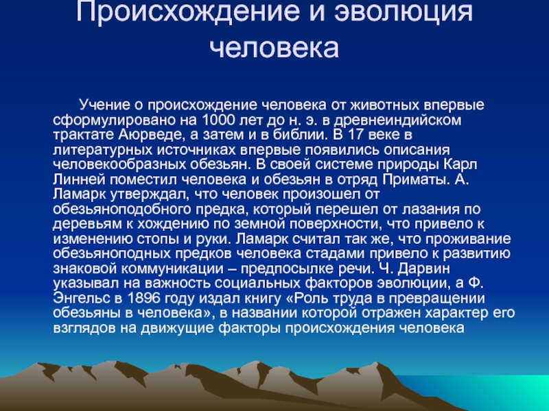 происхождение человека от животных впервые сформулировано на 1000 лет до н. э. в древнеиндийском трактате Аюрведе, а затем и в библии. В 17 веке в литературных источниках впервые появились описания человекообразных обезьян. В своей системе природы Карл Линней поместил человека и обезьян в отряд Приматы. А. Ламарк утверждал, что человек произошел от обезьяноподобного предка, который перешел от лазания по деревьям к хождению по земной поверхности, что привело к изменению стопы и руки. Ламарк считал так же, что проживание обезьяноподных предков человека стадами привело к развитию знаковой коммуникации – предпосылке речи. Ч. Дарвин указывал на важность социальных факторов эволюции, а Ф. Энгельс в 1896 году издал книгу «Роль труда в превращении обезьяны в человека», в названии которой отражен характер его взглядов на движущие факторы происхождения человека