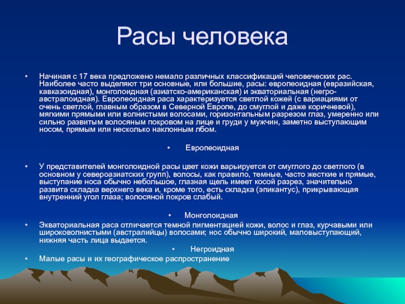 человечеством. Расы человека характеризуются общими наследственными физическими особенностями, связанными с единством происхождения (моногенизм) и определенной областью распространения. Наиболее отчетливо выделяются три основные группы рас — негроидная, европеоидная и монголоидная, которые принято называть большими расами. Признаки отличия рас (цвет кожи, глаз, волос, форма черепа, длина тела и т. д.) имеют второстепенное значение, все расы обладают равными биологическими возможностями для достижения высокого уровня цивилизации.