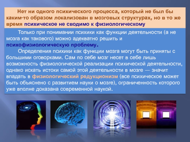 Определения психики как функции мозга могут быть приняты с большими оговорками. Сам по себе мозг несет в себе лишь возможность физиологической реализации психической деятельности, однако искать истоки самой этой деятельности в мозге — значит впадать в физиологический редукционизм (все психическое может быть объяснено с развитием науки о мозге), ограниченность которого уже вполне доказана современной наукой.