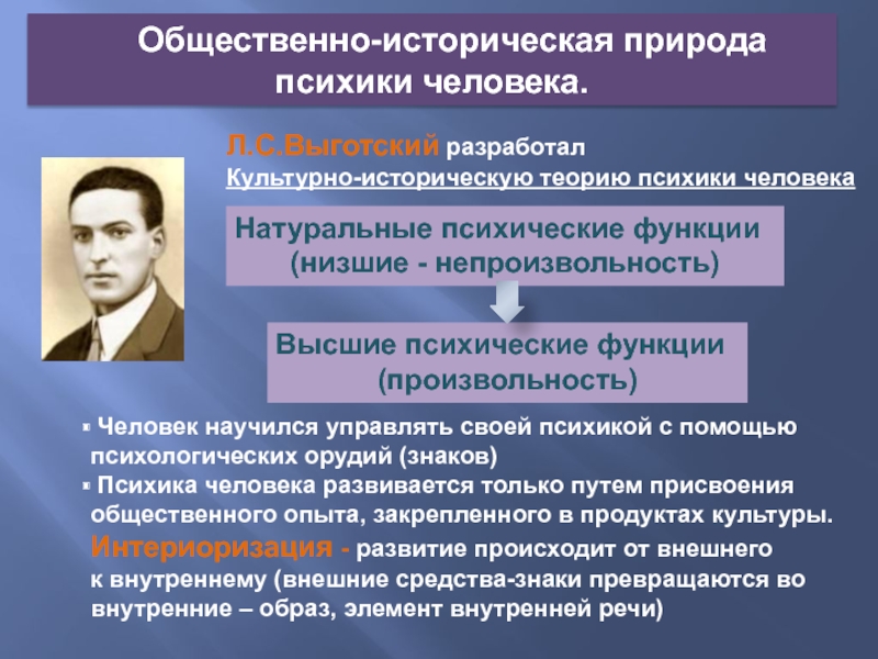 Человек научился управлять своей психикой с помощью психологических орудий (знаков)