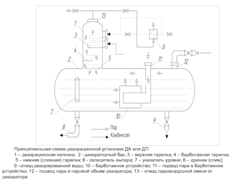 9 –отвод деаэрированной воды; 10 – барботажное устройство; 11 – подвод пара в барботажное устройство; 12 – подвод пара в паровой объем деаэратора; 13 – отвод паровоздушной смеси от деаэратора