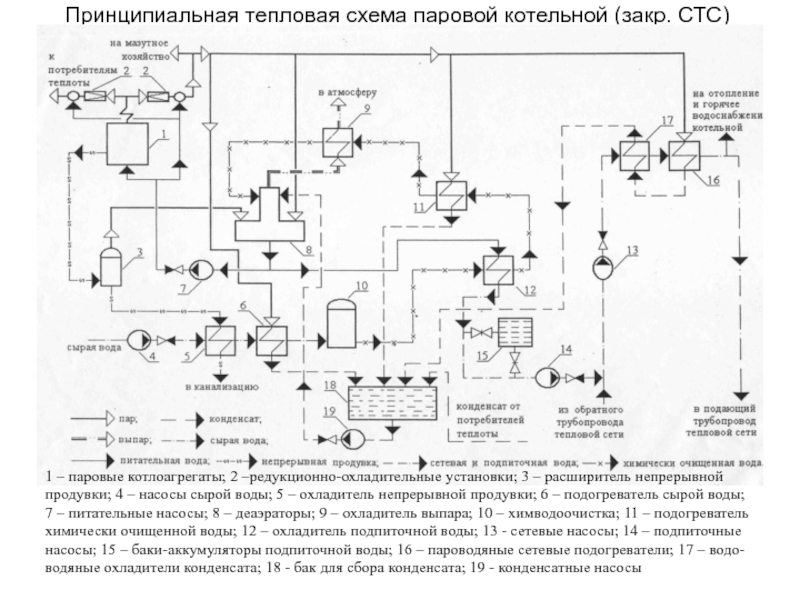паровые котлоагрегаты; 2 –редукционно-охладительные установки; 3 – расширитель непрерывной продувки; 4 – насосы сырой воды; 5 – охладитель непрерывной продувки; 6 – подогреватель сырой воды; 7 – питательные насосы; 8 – деаэраторы; 9 – охладитель выпара; 10 – химводоочистка; 11 – подогреватель химически очищенной воды; 12 – охладитель подпиточной воды; 13 - сетевые насосы; 14 – подпиточные насосы; 15 – баки-аккумуляторы подпиточной воды; 16 – пароводяные сетевые подогреватели; 17 – водо-водяные охладители конденсата; 18 - бак для сбора конденсата; 19 - конденсатные насосы