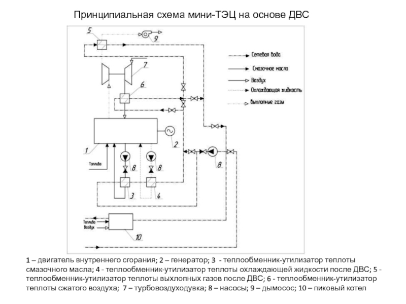 сгорания; 2 – генератор; 3 - теплообменник-утилизатор теплоты смазочного масла; 4 - теплообменник-утилизатор теплоты охлаждающей жидкости после ДВС; 5 - теплообменник-утилизатор теплоты выхлопных газов после ДВС; 6 - теплообменник-утилизатор теплоты сжатого воздуха; 7 – турбовоздуходувка; 8 – насосы; 9 – дымосос; 10 – пиковый котел