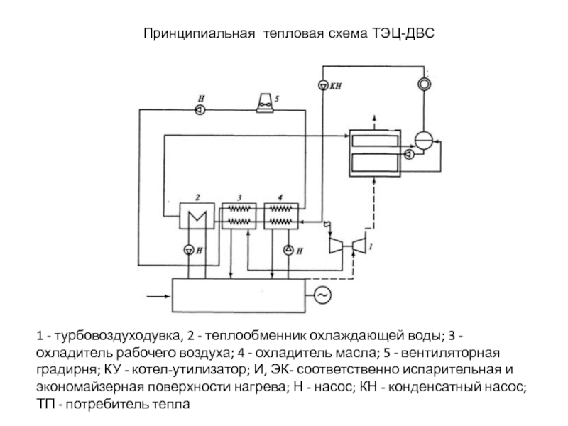 воды; 3 - охладитель рабочего воздуха; 4 - охладитель масла; 5 - вентиляторная градирня; КУ - котел-утилизатор; И, ЭК- соответственно испарительная и экономайзерная поверхности нагрева; Н - насос; КН - конденсатный насос; ТП - потребитель тепла