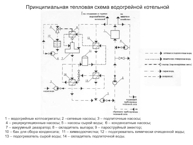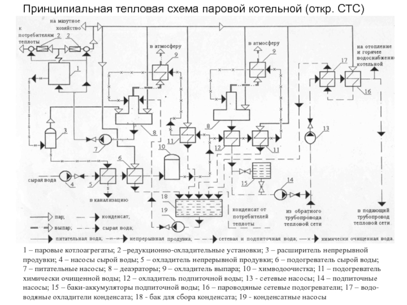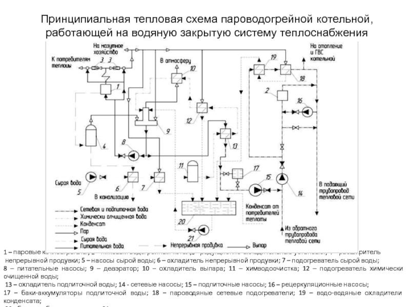2 –редукционно-охладительные установки; 3 – расширитель непрерывной продувки; 4 – насосы сырой воды; 5 – охладитель непрерывной продувки; 6 – подогреватель сырой воды; 7 – питательные насосы; 8 – деаэраторы; 9 – охладитель выпара; 10 – химводоочистка; 11 – подогреватель химически очищенной воды; 12 – охладитель подпиточной воды; 13 - сетевые насосы; 14 – подпиточные насосы; 15 – баки-аккумуляторы подпиточной воды; 16 – пароводяные сетевые подогреватели; 17 – водо-водяные охладители конденсата; 18 - бак для сбора конденсата; 19 - конденсатные насосы