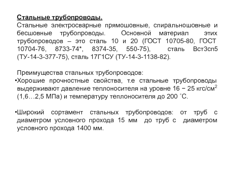 Хорошие прочностные свойства, т.е стальные трубопроводы выдерживают давление теплоносителя на уровне 16 − 25 кгс/см2 (1,6…2,5 МПа) и температуру теплоносителя до 200 ˚С.