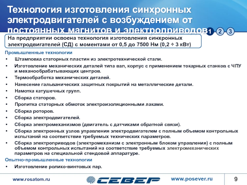 На предприятии освоена технология изготовления синхронных электродвигателей (СД) с моментами от 0,5 до 7500 Нм (0,2 ÷ 3 кВт)