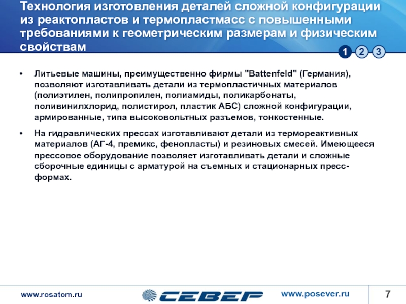 Литьевые машины, преимущественно фирмы "Battenfeld" (Германия), позволяют изготавливать детали из термопластичных материалов (полиэтилен, полипропилен, полиамиды, поликарбонаты, поливинилхлорид, полистирол, пластик АБС) сложной конфигурации, армированные, типа высоковольтных разъемов, тонкостенные.