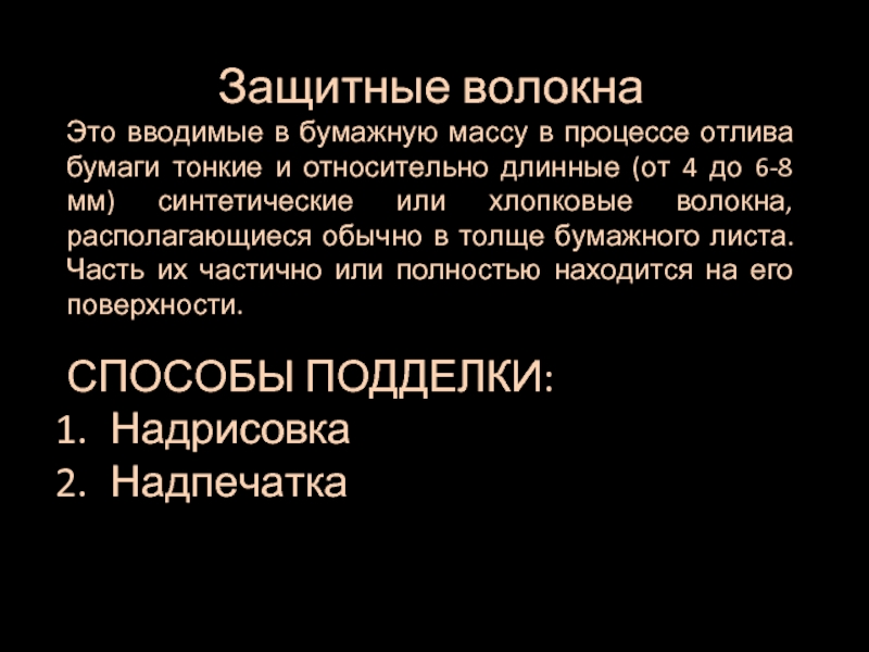 и относительно длинные (от 4 до 6-8 мм) синтетические или хлопковые волокна, располагающиеся обычно в толще бумажного листа. Часть их частично или полностью находится на его поверхности.