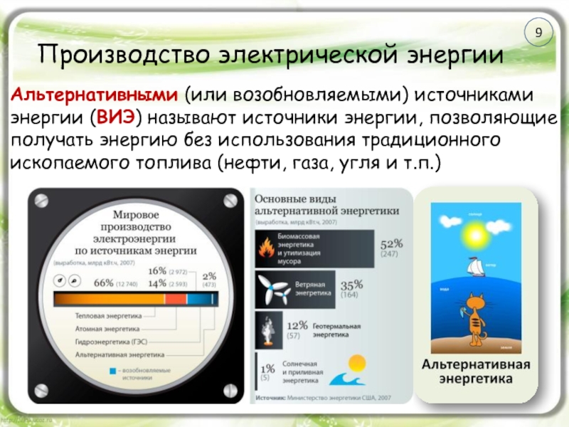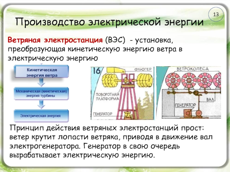 Принцип действия ветряных электростанций прост: ветер крутит лопасти ветряка, приводя в движение вал электрогенератора. Генератор в свою очередь вырабатывает электрическую энергию.
