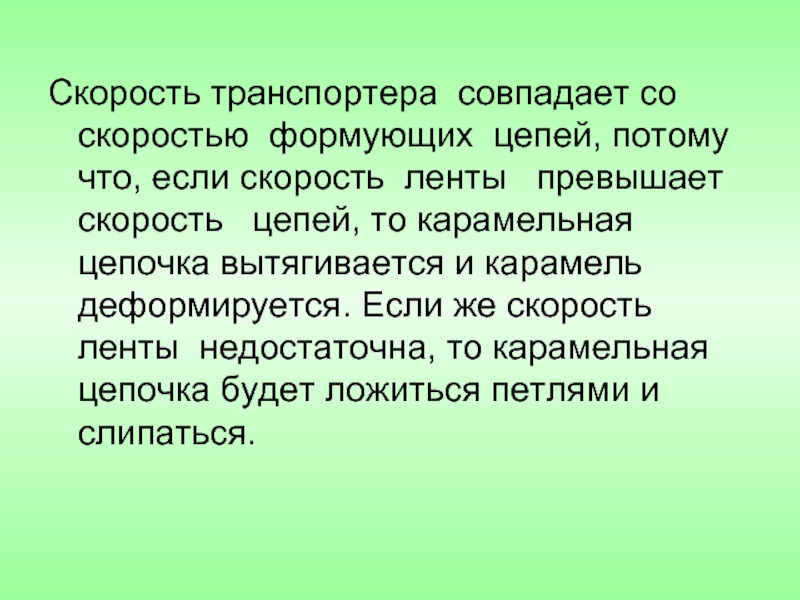 Слайд 46Скорость транспортера совпадает со скоростью формующих цепей, потому что, если скорость