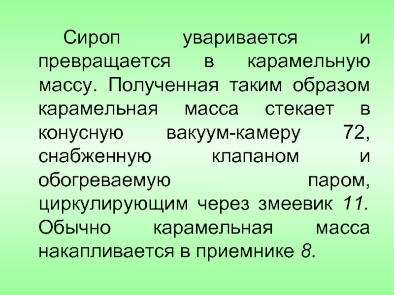 масса стекает в конусную вакуум-камеру 72, снабженную клапаном и обогреваемую паром, циркулирующим через змеевик 11. Обычно карамельная масса накапливается в приемнике 8.