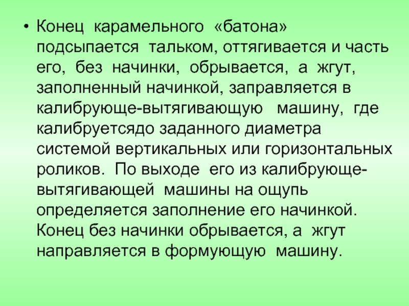 Слайд 38Конец карамельного «батона» подсыпается тальком, оттягивается и часть его, без начинки,